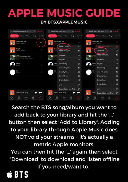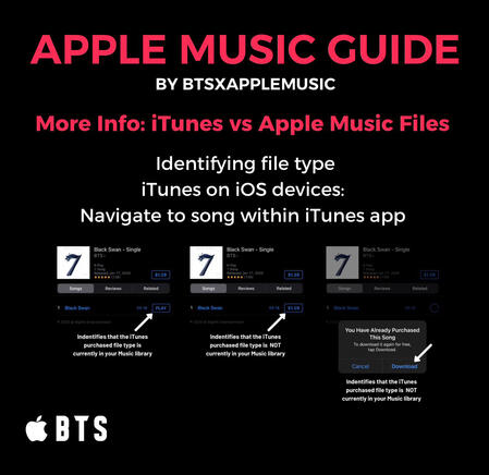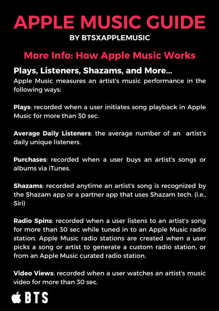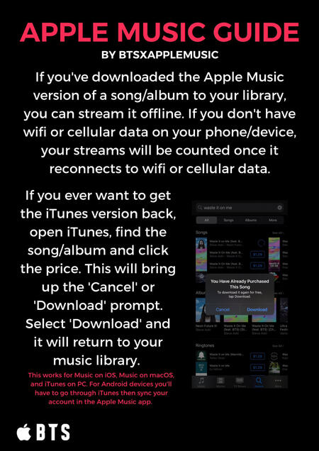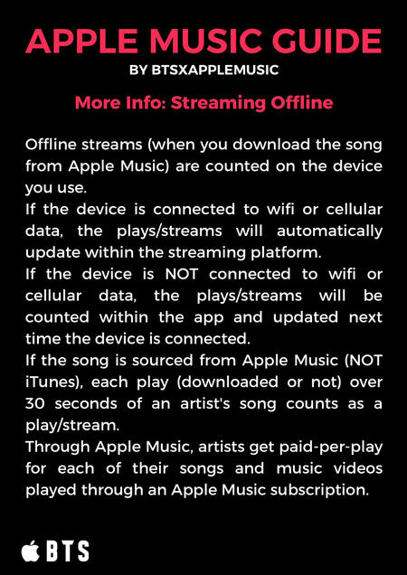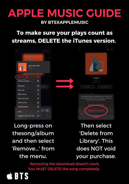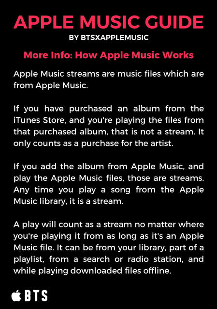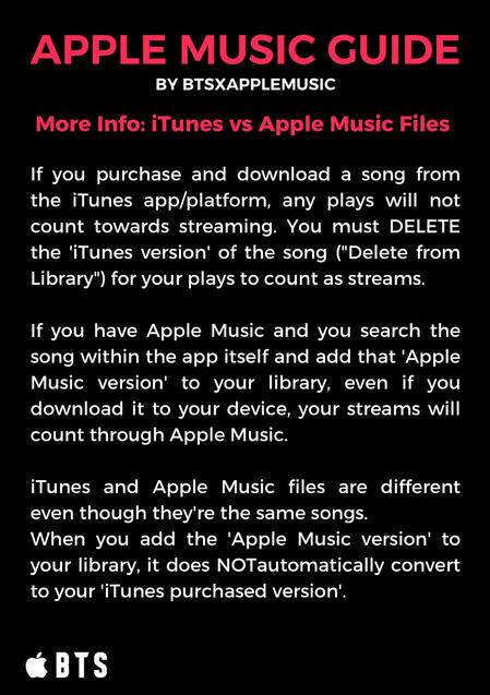 The songs MUST be from Apple Music NOT iTunes! Purchasing songs on iTunes helps BTS chart globally with their songs and albums and helps their Billboard charting positions. But songs purchased via iTunes do NOT count for streams! iTunes songs must be DELETED from your library (not just download removed) to guarantee your plays are being counted as Apple Music STREAMS.
