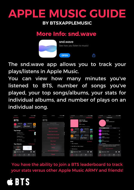 The snd.wave app allows you to track your plays/listens in Apple Music. You can view how many minutes you've listened to BTS, number of songs you've played, your top songs/albums, your stats for individual albums, and number of plays on an individual song. Through the snd.wave app, you have the ability to join a BTS leaderboard to track your stats versus other Apple Music ARMY and friends!